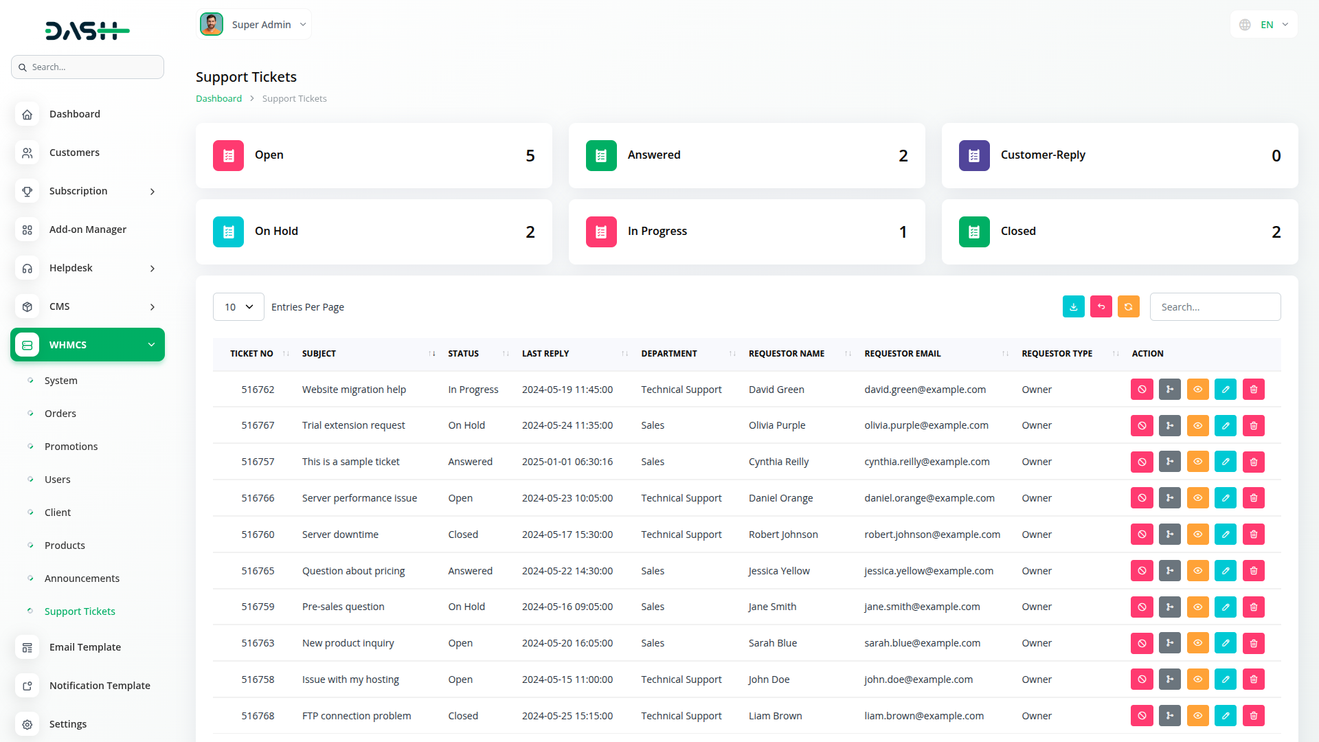 Deliver exceptional customer support through advanced ticket management and departmental organization capabilities. Organize support tickets by departments, status categories, priority levels, and detailed requestor information with communication histories. Block problematic senders, merge related tickets, maintain comprehensive notes, and track reply patterns across departments. Manage ticket statuses from opening through resolution with complete audit trails and performance monitoring.